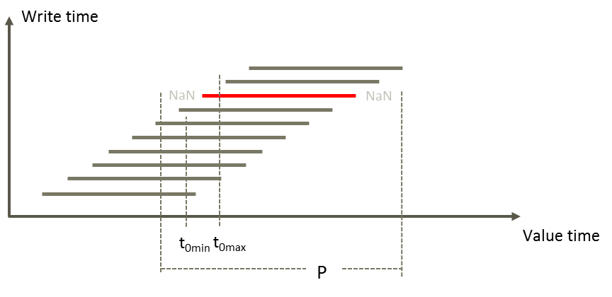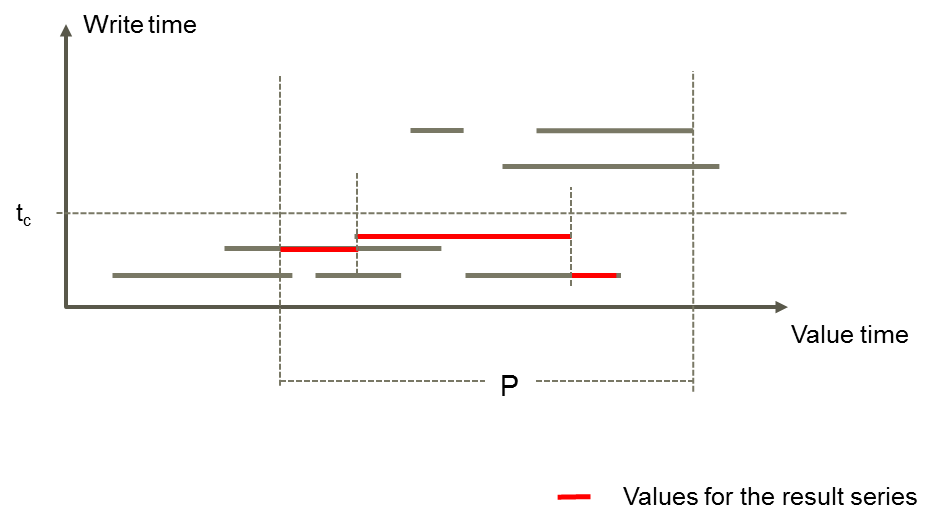 Historical values means that previously saved values are not overwritten when saving new values. The figure below shows a time series having values with various write times. The Calculator returns the values indicated by red when you ask for the most recently written historical values written before tc.