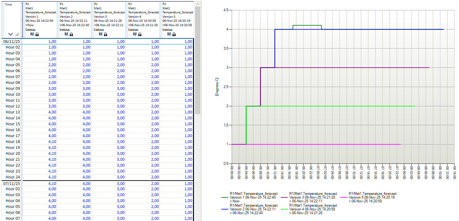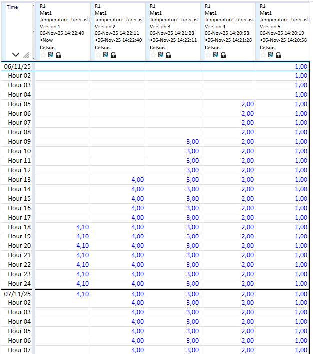 In the function descriptions there are some examples based on a sequence of write operations. These values are presented in a Nimbus client view shown below. The header text for each version gives information on the validity interval for which the time series had the values shown in each column: