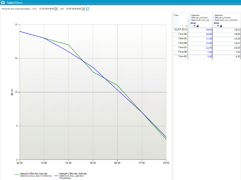 The value for each time step using the gliding interval 3, is calculated by summarizing the previous value, the current value and the next value, divided by 3. Se example:). Selects the time step 01.07.14 05:00: