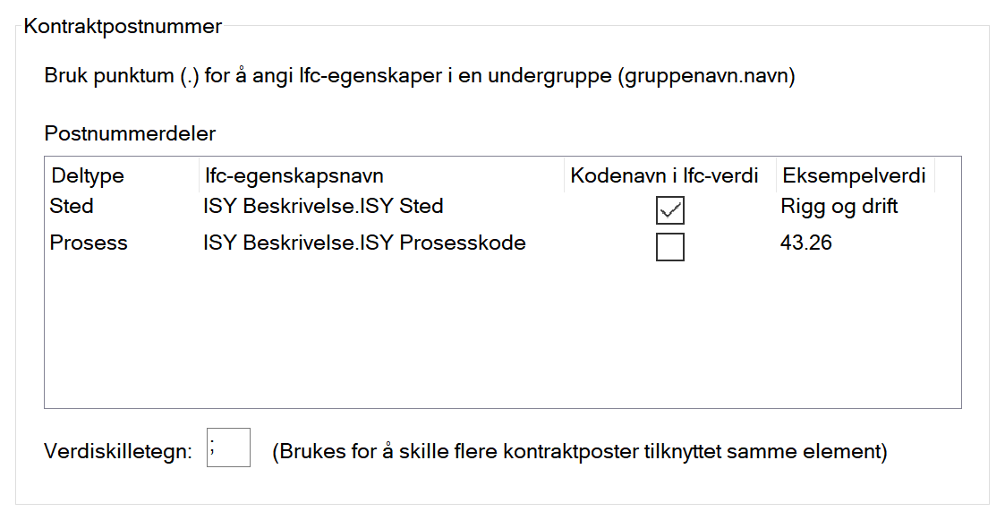 Bruk innstillingene her for å koble relevante deler i kontrakten med attributter slik de vises i Gemini Terrain, for å kunne vise relevante kontraktposter i Gemini 3D Field. I eksempelet skal feltene Sted og Prosess fylles ut, men dette vil variere mellom kontrakter. Programmet vil selv be om de relevante postnummerdelene.