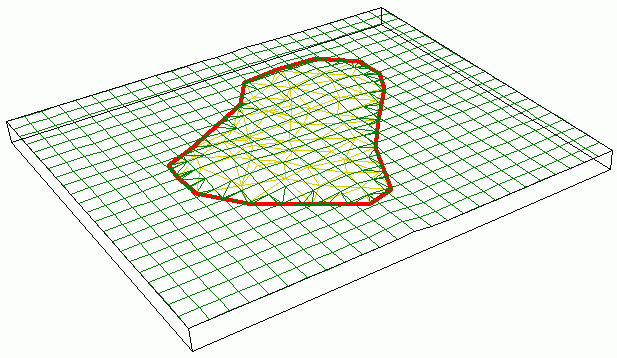 Med valget Bruk høyder fra referansesjikt og legg til verdi blir høydene i referansesjiktet kopiert utenfor begrensningskonturen. Dette valget er aktuelt hvis du ønsker å kombinere data fra to ulike lag. En typisk problemstilling er at du har et digitalt kart for området, men har målt inn deler av området hvor du må ha høy nøyaktighet.