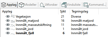 Med knappen Brukte sjikt... får du en samlet oversikt over alle sjikt som er lagt til i én eller flere tegninger i prosjektet. Applikasjonslag som ikke er i bruk i prosjektet, blir ikke listet.