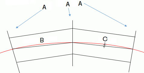 Figuren viser: A = Tverrprofiler, B = Horisontalkurvatur, C = Pilhøyde