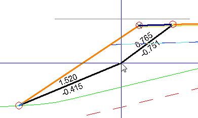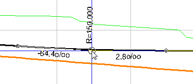 I SFI-modell kan du ha valgt en dimensjoneringsklasse for vegen. Da vil maksimal stigning for vertikalkurvaturen være definert. Hjelpelinjer tegnes automatisk for å vise området du må holde deg innenfor for å tilfredsstille maksimal stigning i lengdeprofilet. Går du utenfor dette området, tegnes den dynamiske linjen med rødt.