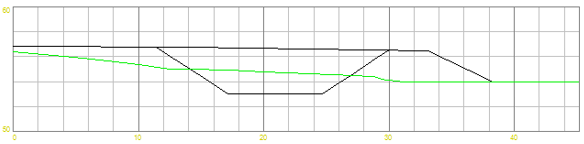 Triangelnettet for skjæring/fylling (flatene utenfor begrensningskonturen) bygger programmet på grunnlag av genererte profiler hvor begrensningskonturen er senterlinje. Parametrene for profilgenerering finner du under arkfanen Opsjoner.