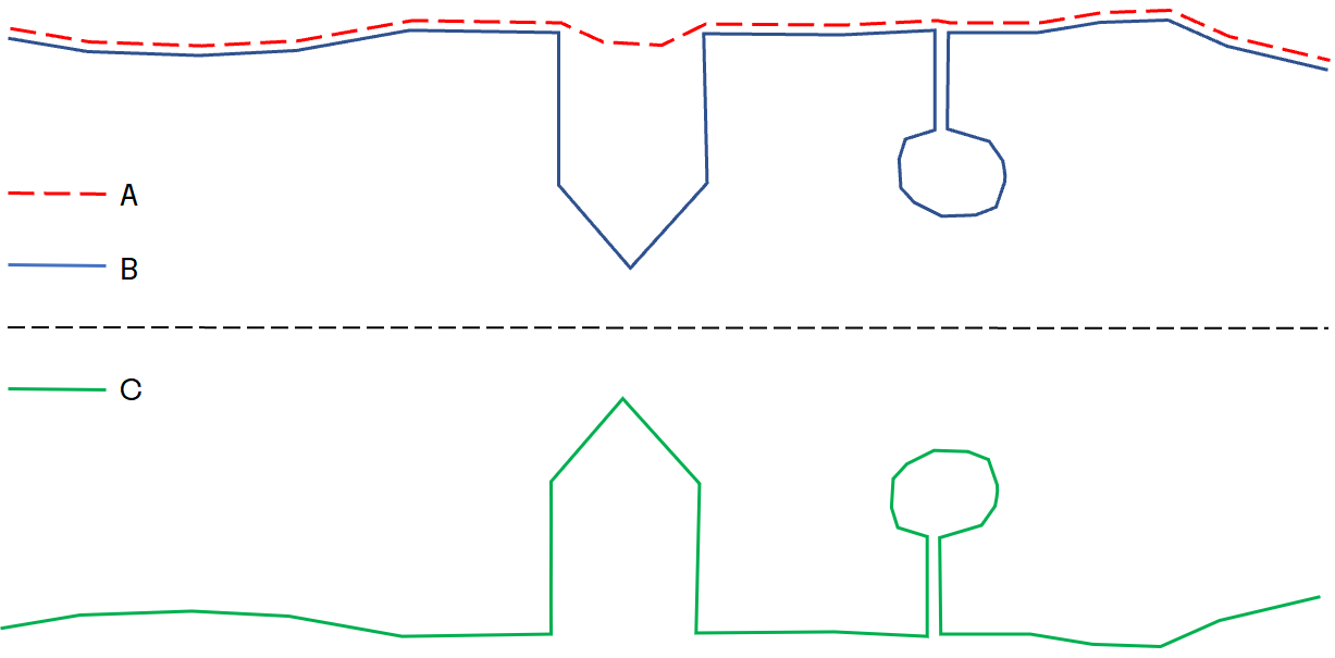 A* = Simulated cloth, B = Raw data upside down, C* = Raw terrain surface