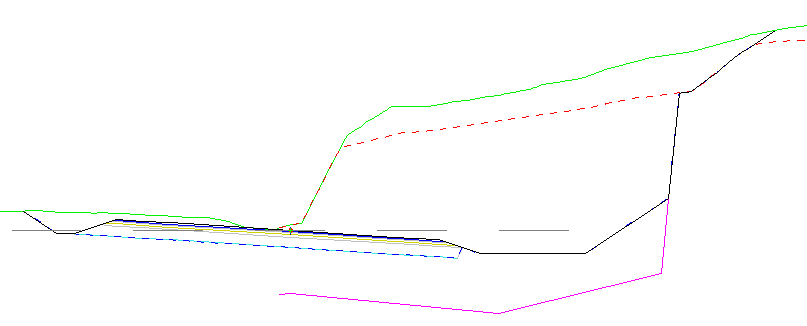 This means the program can build varying pavement in half cuts. The program selects pavement for soil in fill and pavement for rock in cut, as shown in the figure below.