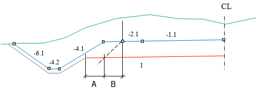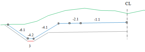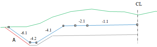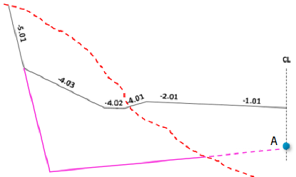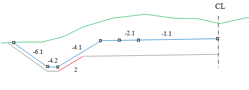 For all layers, you can shape the grading surfaces differently on the right and left sides of the centerline, and you can have as many surfaces as you want. Select Insert with the right mouse button in the surface column to create new surfaces. Surfaces are numbered consecutively from 1 and up. The menu also has an option to insert an end surface.