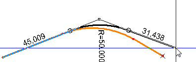 In the SFI model, you may have selected a design class for the road. Then the maximum gradient for the vertical curve will be defined. Helper lines are automatically drawn to show the area you must stay within to meet the maximum gradient in the long section. If you go outside this area, the dynamic line is drawn in red.