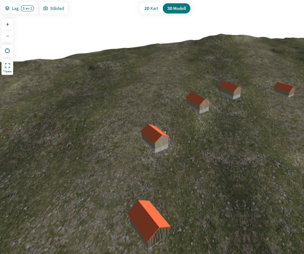 Sjekk at terreng-gridet og de innsatte bygningene vises.