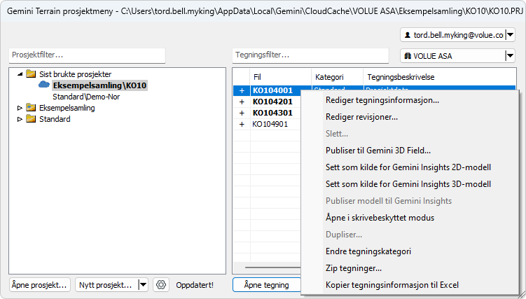 Høyreklikk på tegningen KO104001 Prosjektdata igjen og velg Publiser modell til Gemini Insights.