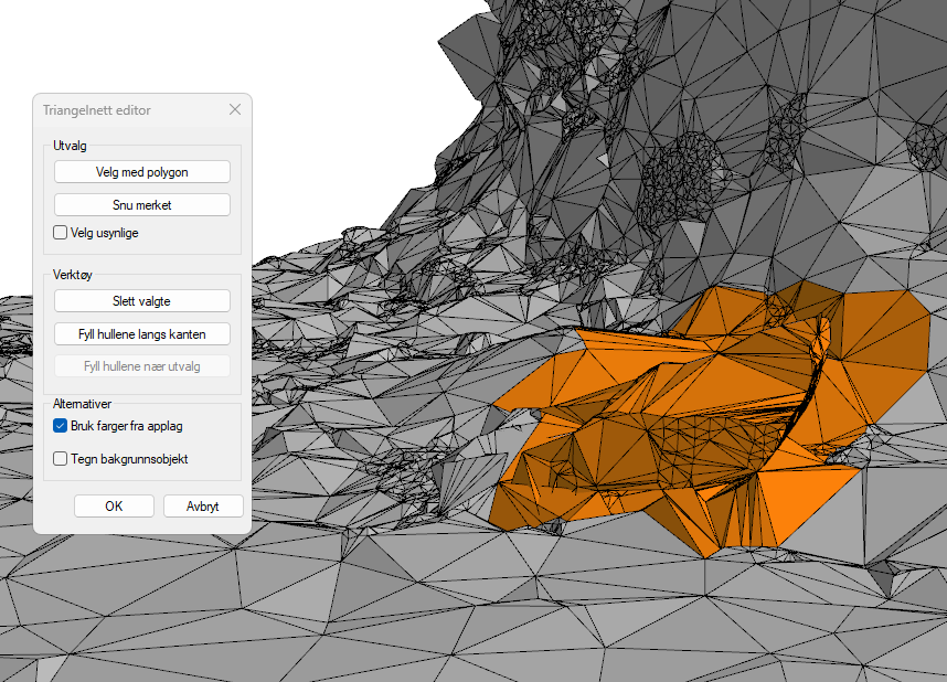 Currently, we can mark triangles with standard DDS-CAD functions and with polygon. Furthermore, we can delete triangles and fill holes.