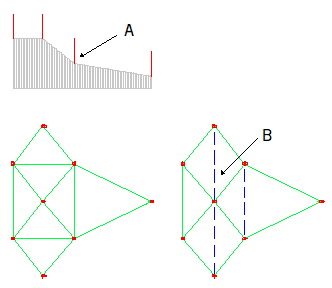 The line can either be a line in an application layer or a line in an SFI model. We can say that the method in Gemini Terrain is an indirect Delaunay triangulation. Based on the line, the points are unfolded to a mathematical plane, subjected to standard triangulation, and folded back.