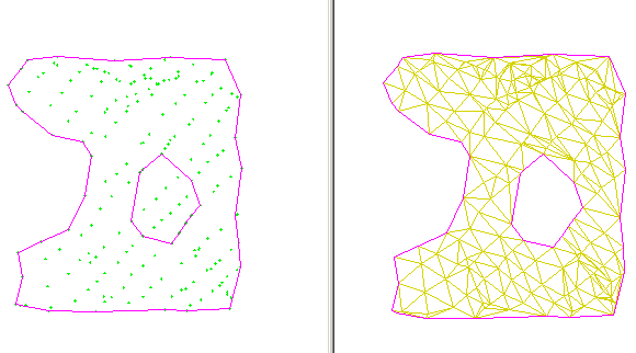 The illustration shows an example with many points, without breaklines and boundary contour, and the result from the triangulation