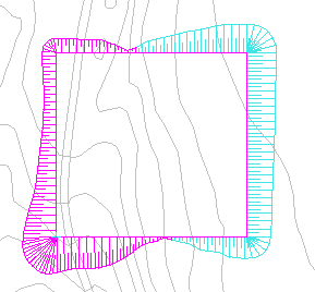 In the helper excavation, you enter the outer boundary that is given and calculate cutting and filling surfaces against future levels. The direction of the outer boundary must be clockwise so that cutting and filling surfaces go inward. You must also swap the values in the parameters for cutting and filling.