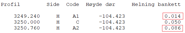 Resulting slopes for the banquet in A1 and A2 are decisive in this log. Negative values mean that the banquet has a slope toward the door.