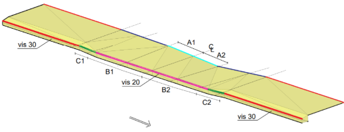 Line A1-A2 is horizontal in the longitudinal direction. Line B1-B2 follows the original tunnel slope. C1-C2 segments are used for transition between special curb height to normal curb height.