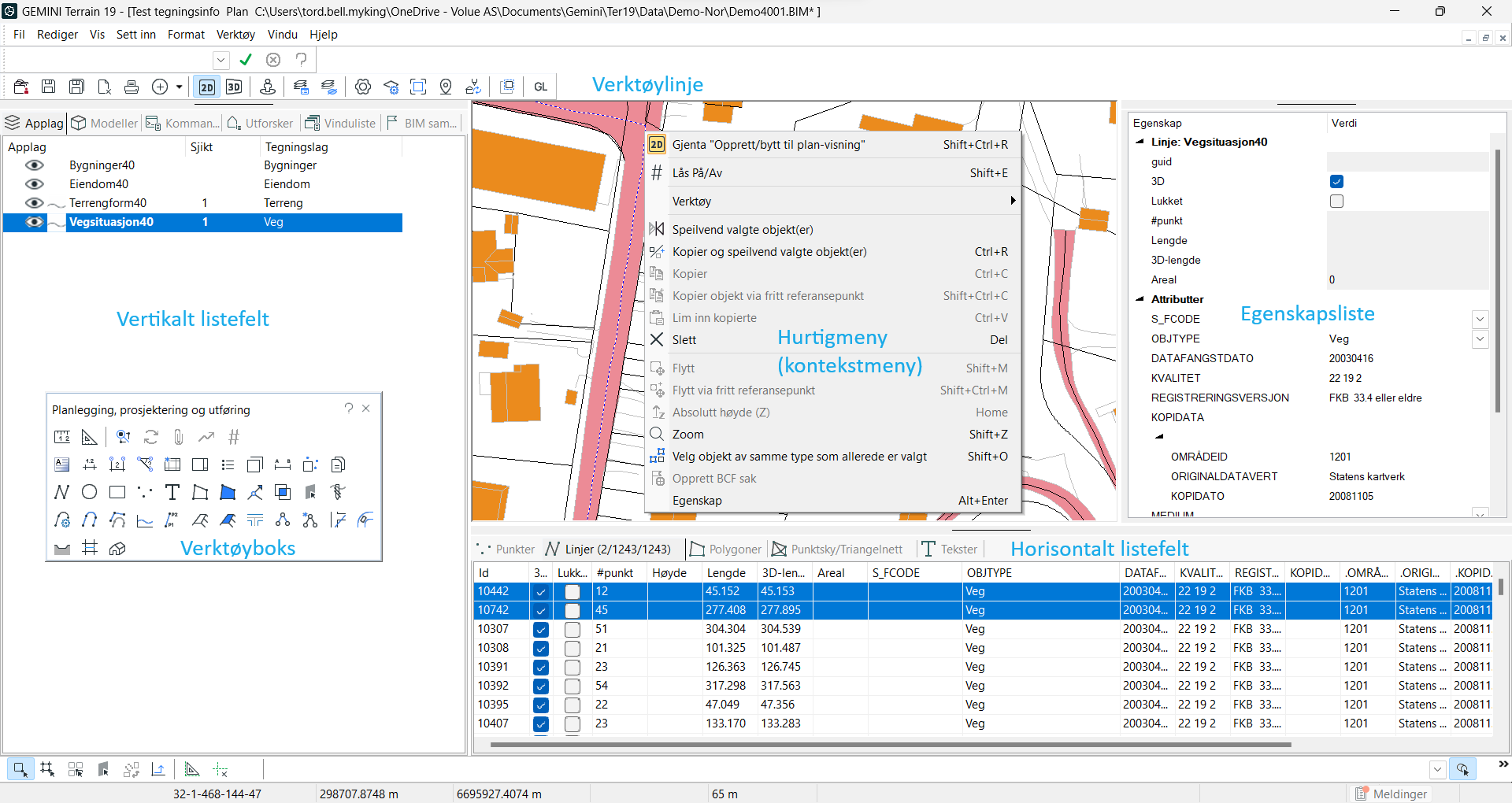 Contains an overview of the inserted models in the drawing: SFI models (road, ditch, tunnel, etc.), building excavations and intersections. Here it is also possible to create SFI models. -