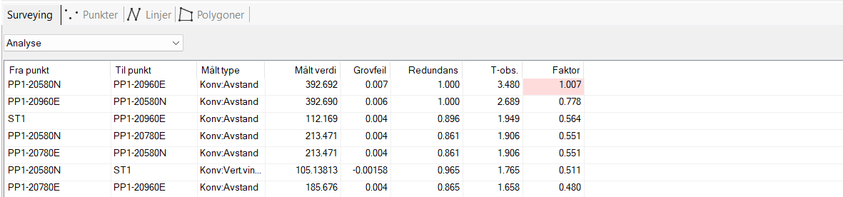 Programmet vil låse et minimum av punkter. Prosessen videre er at en grovfeilsøking automatisk startes for deretter å kunne beregne Største gjenværende grovfeil, Maks. relativ grovfeil og redundans.