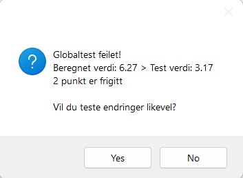 Nå får du melding om at Globaltesten feilet og at to punkt er fristilt. Nå får du spørsmål om du vil teste endringer. Svar Ja på dette.