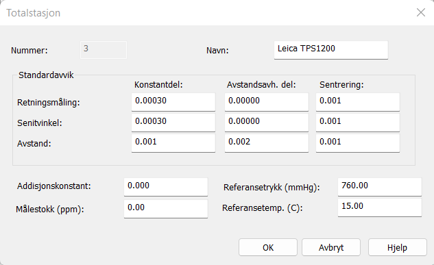 Opprett nytt instrument nr. 3 Leica 1200 med følgende verdier: