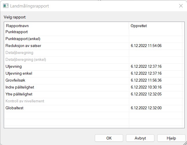 Dialogen viser hvilke analyse- og beregningsrapporter som er tilgjengelig for utskrift.