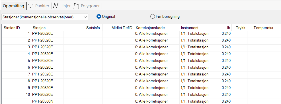 Åpne stasjonslisten for konvensjonelle observasjoner. Du ser at det er målt flere satser for hver stasjon. Er de målt i samme sekvens er de ikke uavhengige og du må midle og redusere satsene.