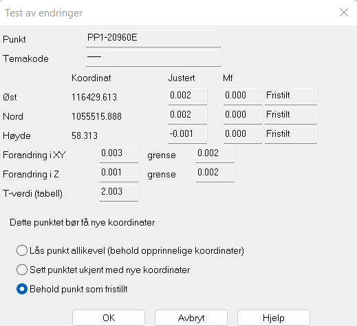 Du ser at posisjonsendringen er større enn grenseverdien, men bare en mm. I det praktiske liv kvier man seg for å innføre nye koordinatverdier. Til vanlig praktiske formål vil en kunne leve med en slik feil, og velger å beholde eksisterende verdier til tross for overskridelse av den statistiske grenseverdien.