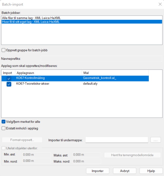 Velg Geometrisk_kontroll.al_ som mal for kontrollmålingene og trykk Importer.