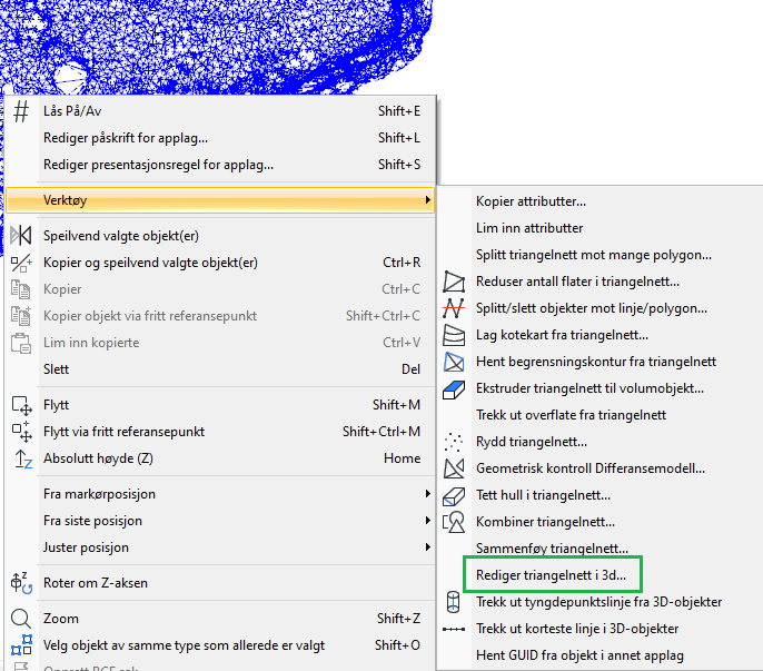 Funksjonen finner vi på kontekstmenyen for triangelnett.