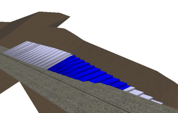 Exempel på skärning berg, där massan är delad i objekt med 10 m längd