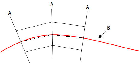 I exemplet är Max. cirkelavvik = 0. A = Tvärprofiler, B = Centerlinje