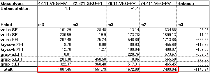 Detta val öppnar en dialog som visar total massbalans för alla beräkningarna, det vill säga om du har överskott eller underskott av massor.