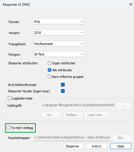 • Med bilagor (bilder, punktmoln, texturer): Välj en tom resultatmapp när du exporterar. DWG-filen får samma namn som mappen, och bilagorna sparas i egna undermappar där.