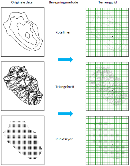Mange ulike interpoleringsmetoder for å beregne et grid fra høydedata er beskrevet i litteraturen. Gemini Terrain har utviklet sine egne metoder for ulike typer høydedata (kotelinjer, triangelnett og punktskyer) i et gmi-lag.