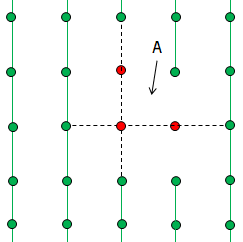 I figuren over ser vi et eksempel der ett gridpunkt ikke har fått beregnet høyde. Programmet kjører da vertikale plan begge retninger. For hvert plan blir høyden interpolert, og endelig verdi blir middelet av disse to verdiene.