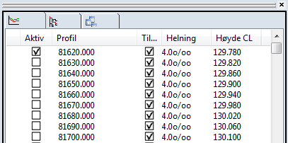 At profilene er tiltet vil vi se i det vertikale listefeltet for tverrprofilredigering.