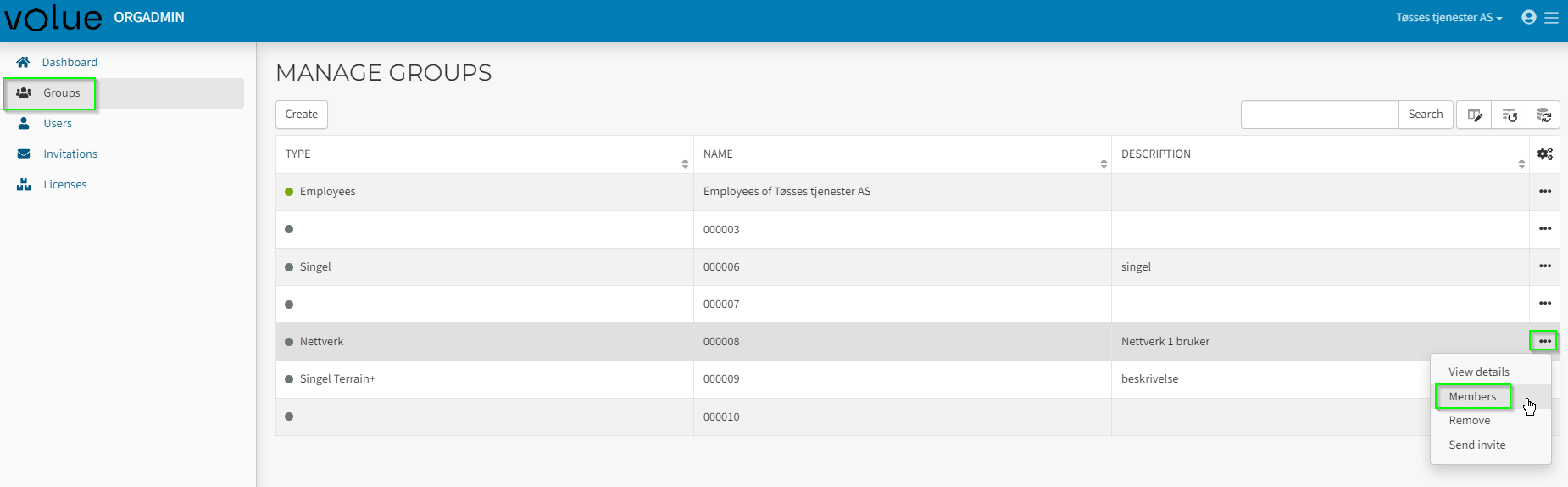 Kjøper bedriften en singel-lisens, vil den bli listet opp her. Går du inn på Members (de tre prikkene helt til høyre på linjen), ser du hvilken sluttbruker som er lagt til i gruppen, altså hvem som har tilgang til lisensen. Lisensen blir låst til denne brukeren, og enhver endring av sluttbruker må skje via Volue. Det anbefales å legge til ekstra informasjon under beskrivelse for bedre oversikt. Dette gjør du ved å trykke på de tre prikkene for detaljer og deretter på Edit.