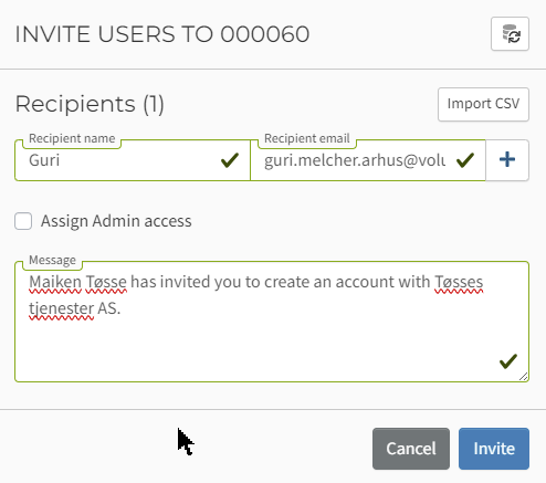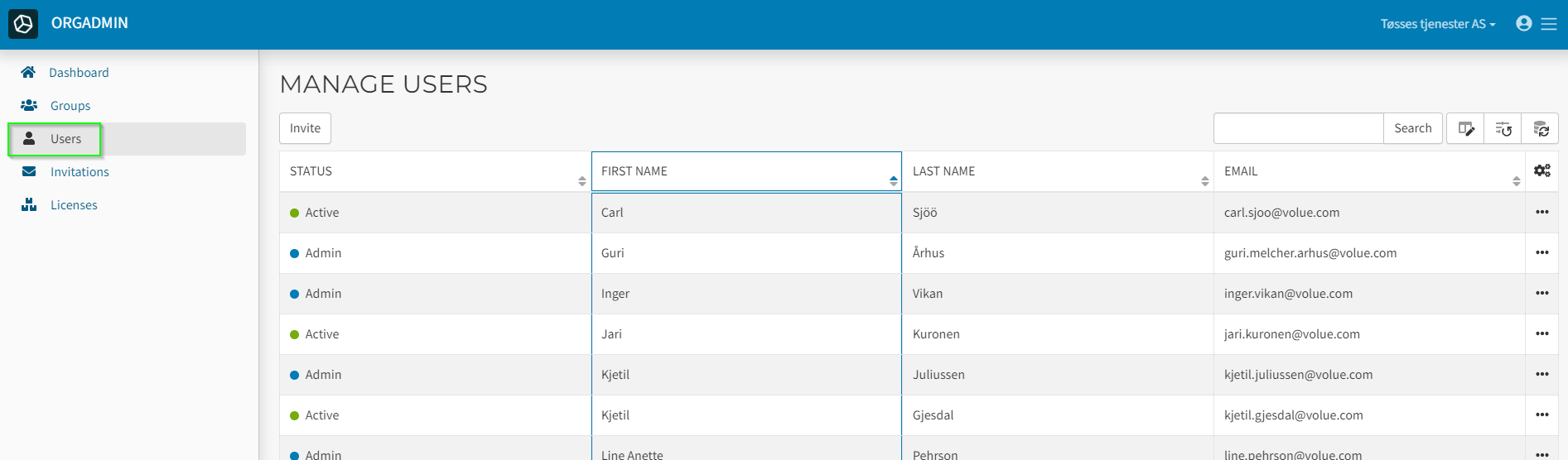 Her får du oversikt over hvem som er invitert inn som sluttbruker i bedriften, og om de har akseptert invitasjonen. Her kan du også invitere nye sluttbrukere.