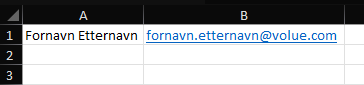 Eksempel på CSV-fil vist i Excel, med kolonne A for fornavn og etternavn og kolonne B for brukernavn (e-post)
