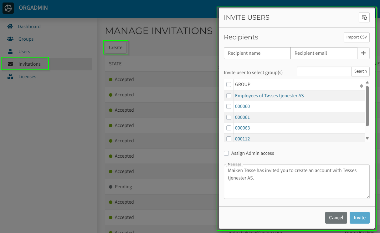 Under Invitations kan du se om sluttbrukeren har akseptert: