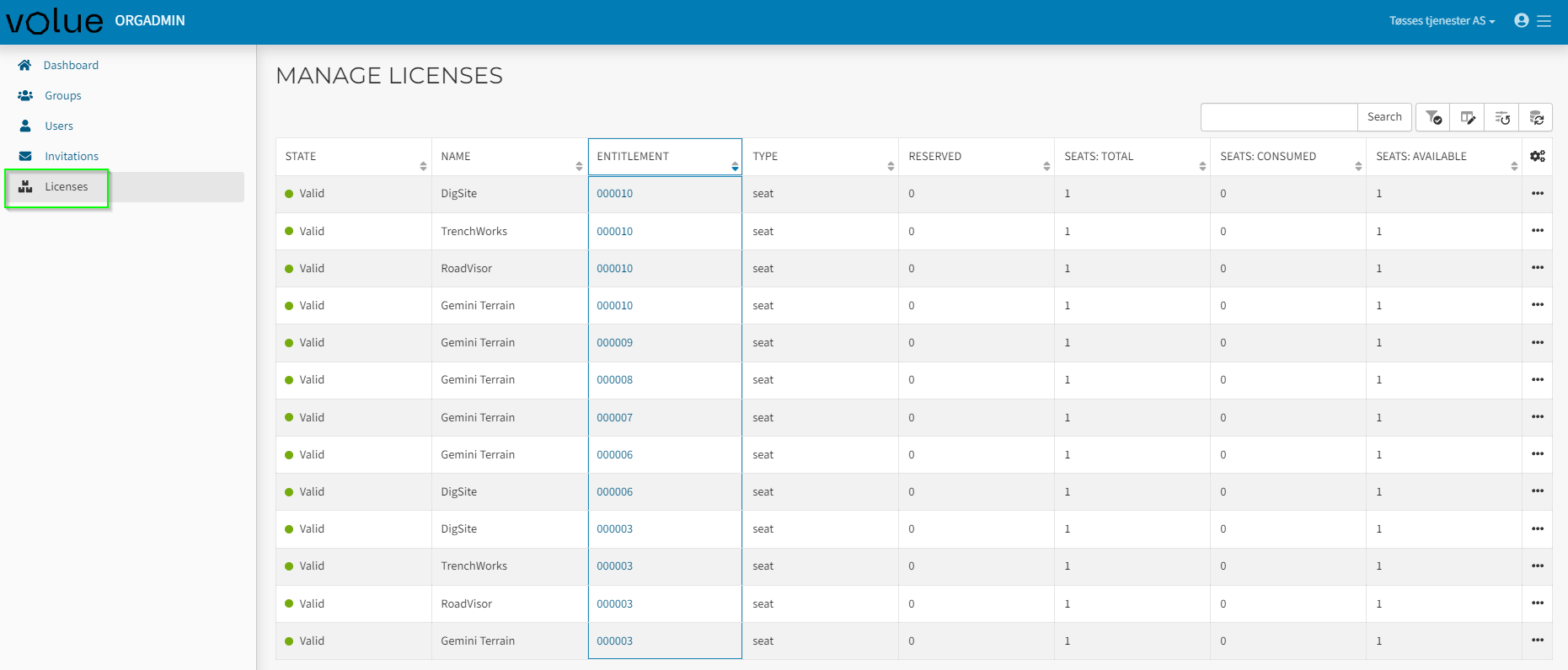 Under Licenses finner du kolonnen Entitlement, som viser alle lisenser og moduler bedriften har, beskrevet med lisensnummer.