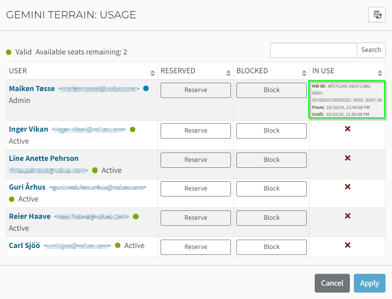 Organisasjonsadministrator bør først forsøke å kontakte brukeren slik at vedkommende kan lukke Gemini Terrain. Hvis dette ikke er mulig, kan organisasjonsadministratoren blokkere brukeren via lisensoversikten. Vent deretter 10 minutter til token utløper, og brukeren blir automatisk logget ut. Setet blir da ledig for andre brukere. Hvis samme bruker skal ha tilgang igjen, må blokkeringen fjernes. Alternativt kan organisasjonsadministratoren kontakte Volue.