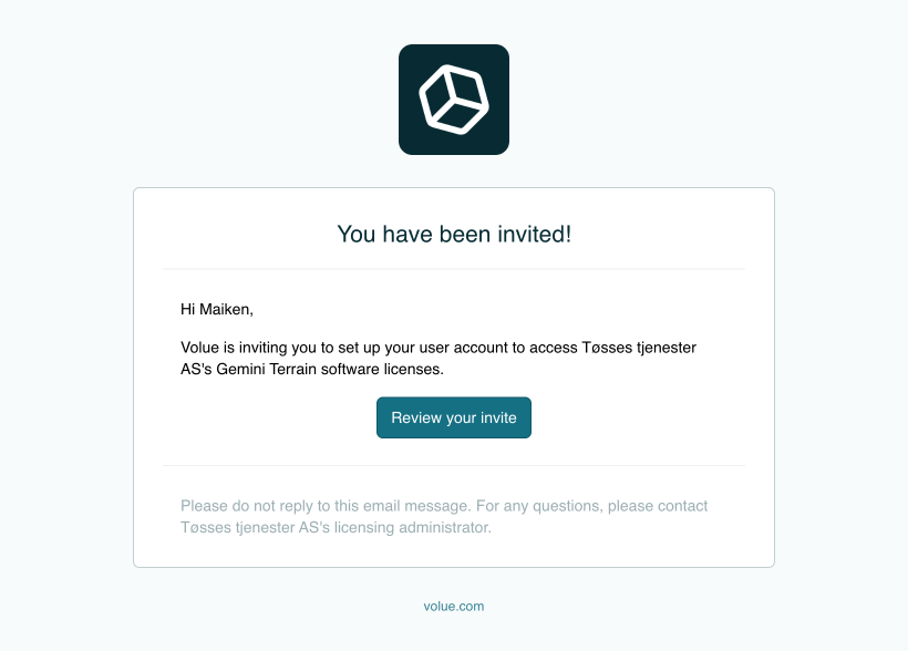En invitasjon til organisasjonsadministrasjonsverktøyet sendes til deg som er registrert som lisenskontakt i bedriften. Invitasjonen kommer på e-post fra license@volue.com og må aksepteres for å få tilgang.