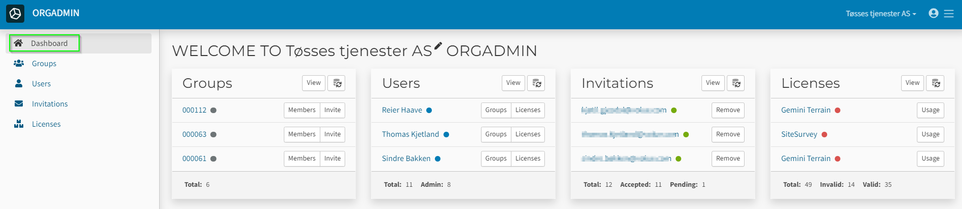 Sluttbrukerne mottar en e-post med invitasjon som må godkjennes. Ved godkjenning må sluttbrukerne logge inn med SSO eller opprette en konto med e-postadresse og passord. Når dette er gjort, kan sluttbrukeren ta i bruk Gemini Terrain. Merk at kun organisasjonsadministrator har tilgang til nettsiden: https://licensing.geminisuite.com/orgadmin