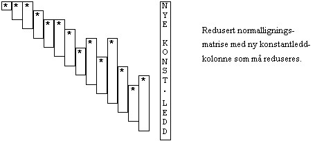 Dette medfører at vi får en ny konstantleddkolonne i normalligningssystemet. Denne må reduseres på vanlig måte, og vi finner koordinatutslagene ved tilbakeløsning av de ukjente.